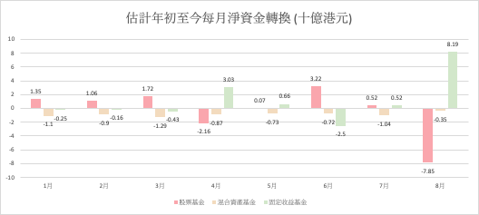 GUM策略及投資分析師雲天輝指出:「市場預期9月美聯儲將首次減息,有望迎來2年半來高息年代的結束,但同時美國就業數據不及預期令美國經濟前景出現隱憂。資金流向反映成員風險偏好改變, 8月單月近82億資金湧入低風險資產避險,其中79億由股票基金流出,尤其是美股錄得單月20億流出。」