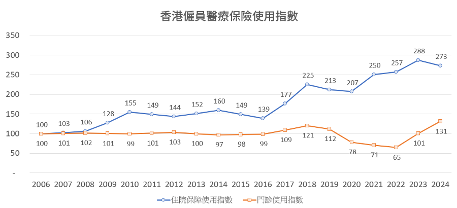 · 門診使用指數則呈另一種趨勢。指數於2006年至2019年一直穩定維持於100至112水平。疫情爆發時,於2020年下跌至78後再進一步下跌至2022年的65。復常後,指數大幅增加至2024年的131,創紀錄以來新高,兩年間升幅高達101%。
